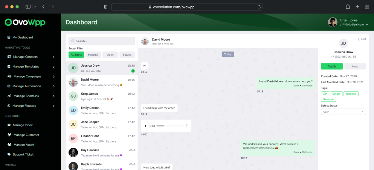 Converta contatos em clientes fiéis com perfis detalhados, histórico e rastreamento de interação. Use filtros e campos personalizados para personalizar sua estratégia de comunicação